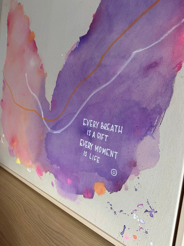 Manchmal reicht ein einziges Wort, um etwas in uns zu bewegen. In der Serie Alltagspoesie treffen abstrakte Farben auf kleine Botschaften. Die Worte entstehen oft aus eigenen Gedanken, Gesprächen oder Momenten, in denen ich selbst etwas gebraucht hätte.Diese Werke gehören zu meinen persönlichsten und beliebtesten. Sie machen Mut, schenken Trost oder bringen einen zum Schmunzeln.